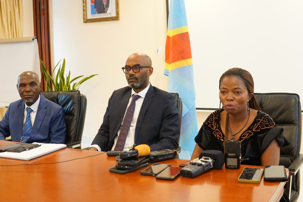 De gauche à droite le Ministre des mines Martin Bitijula, le Ministre des Finances Bernard Muhindo et la Députée provinciale Béatrice Nanvano.